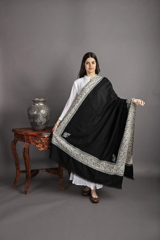 Caviar Pure Pashmina Shawl from Kashmir with Elegant Sozni-Embroidered Motifs by Hand