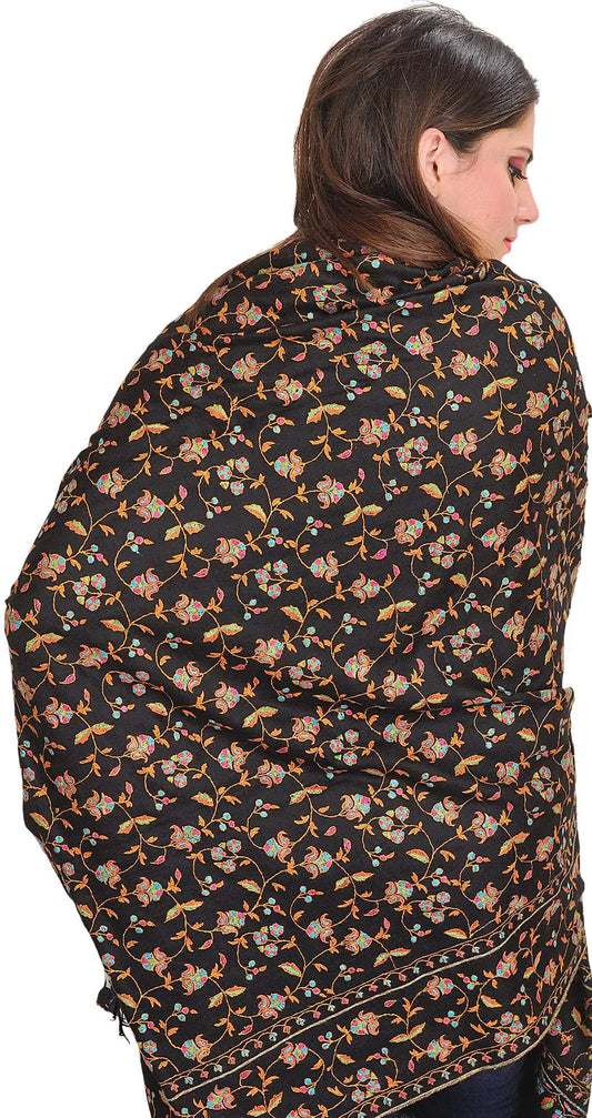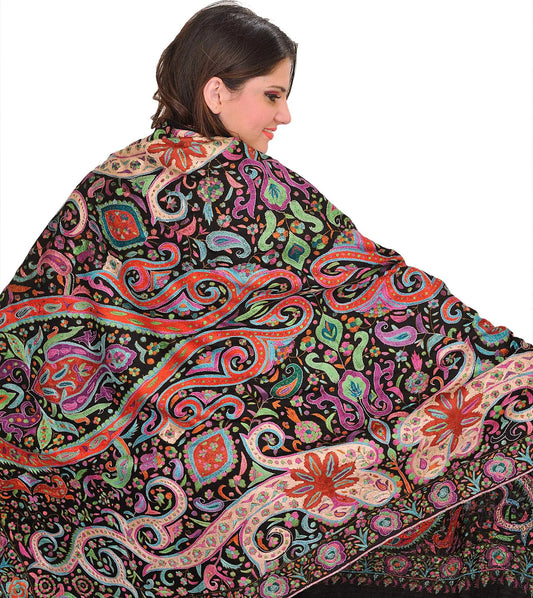 Jet-Black Pashmina Shawl with Indricate Needle Embroidery By Hand