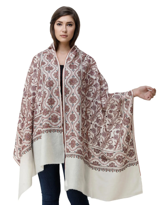 Cream Kashmiri Pure Pashmina Shawl with Papier Mache Hand-Embroidered Maple Leaves