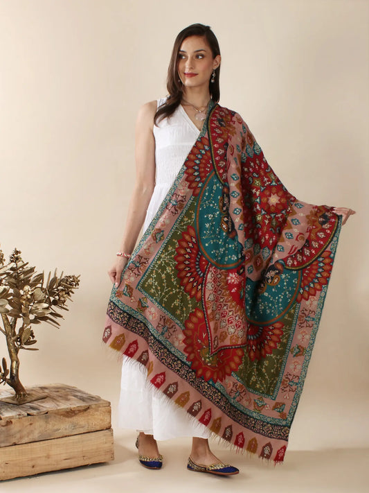 French-Oak Handloom Pure Pashmina Shawl from Kashmir with Sozni-Embroidery by Hand