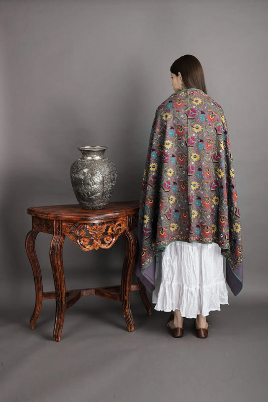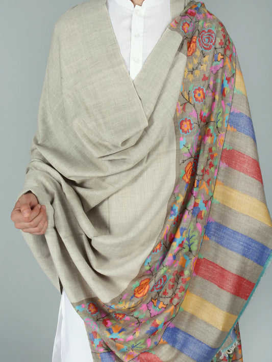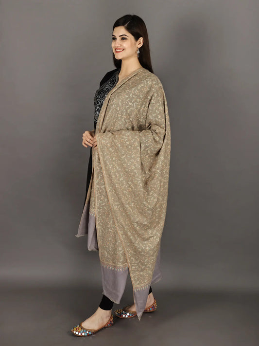 Silver-Cloud Kashmiri Pashmina Shawl with Jafreen Jaal Embroidered Flowers All-Over