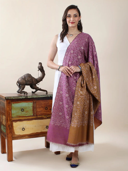 Purple-Brown Reversible Pure Pashmina Shawl With All-Over Sozni Hand-Embroidered Floral Jali
