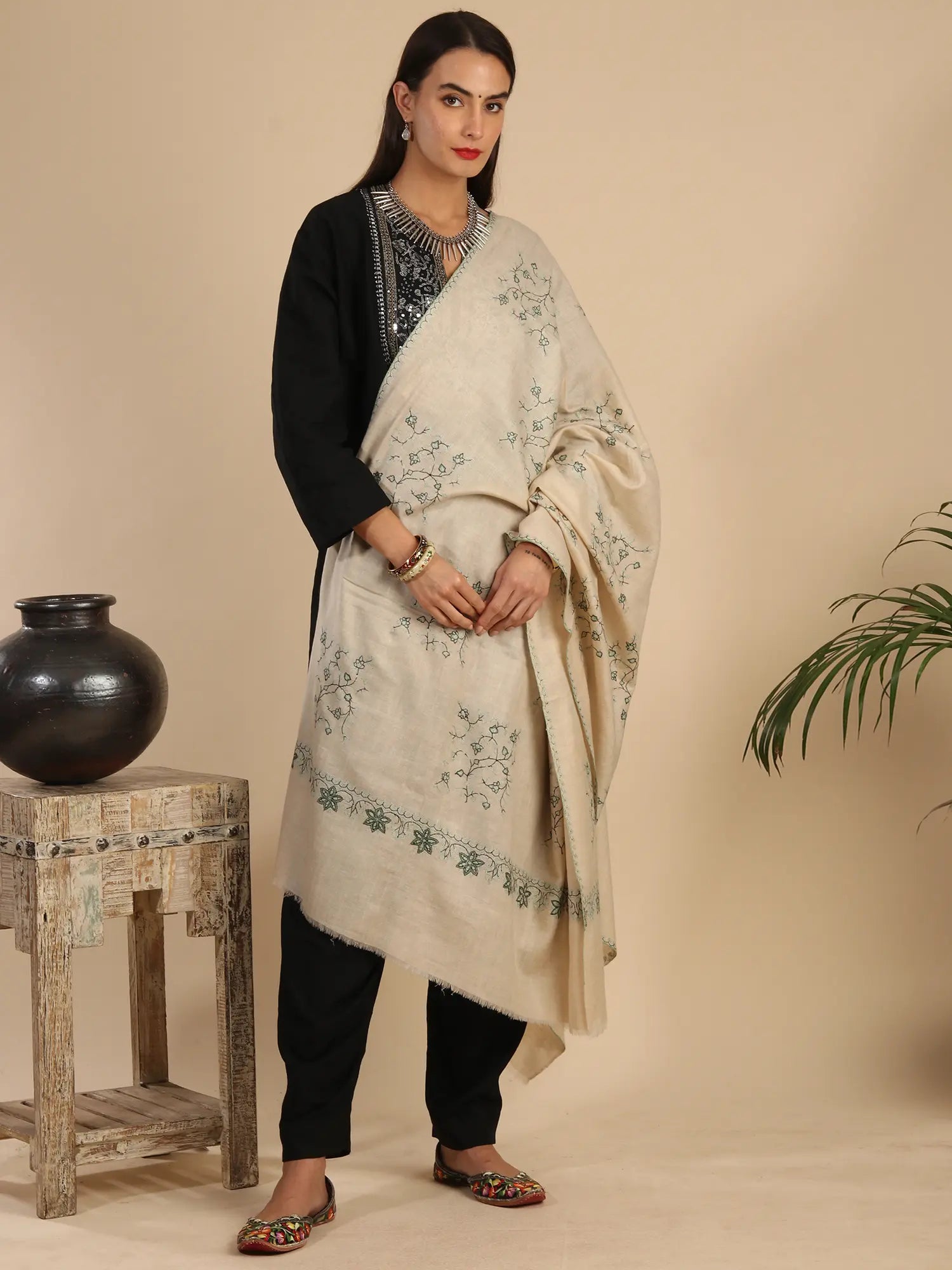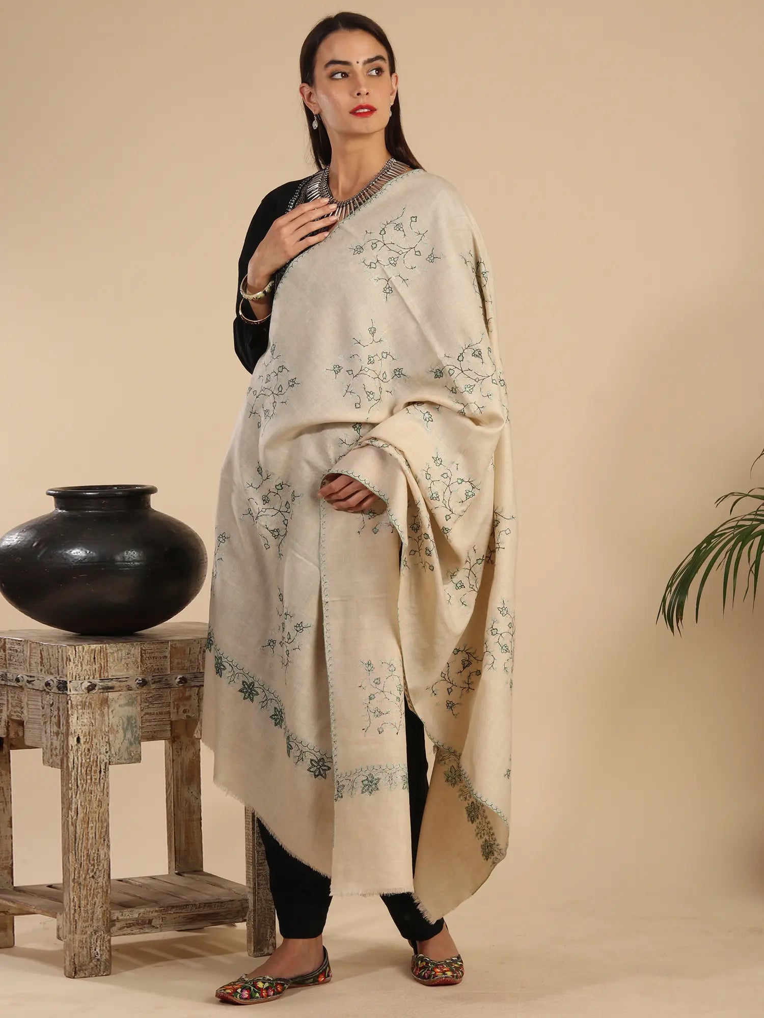 White-Swan Pure Pashmina Sozni Hand-Embroidered Aksi Butta Shawl