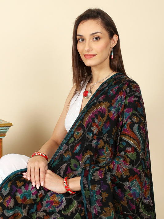 Black-Beauty Pure Pashmina Shawl from Kashmir with Sozni-Embroidery by Hand