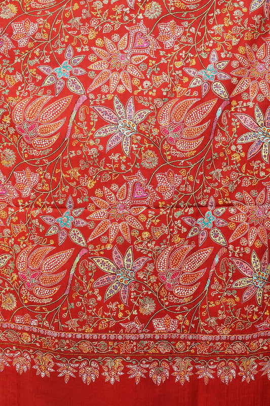 Brick-Red Pure Pashmina Kashmiri Shawl with Sozni Embroidered Flowers