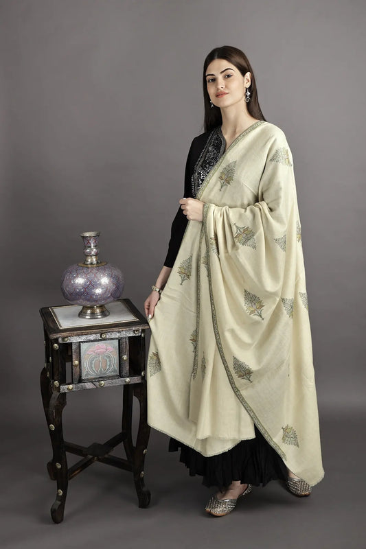 Antique-White Pure Pashmina Shawl from Kashmir with Sozni-Embroidery by Hand