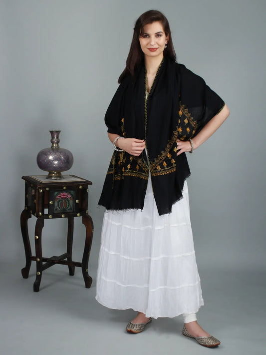 Black-Beauty Pashmina Stole from Kashmir with Sozni Hand-Embroidered Leaves